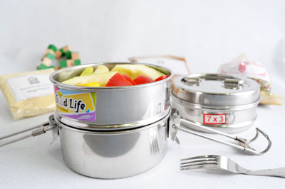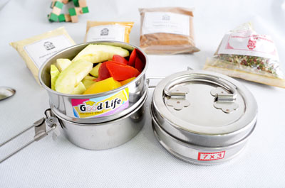 The Tiffin Box is a great way to Eat, Drink, Live in an environmentally friendly way, while enjoying a home-cooked meal at your office or outside. "Tiffin" is an old-fashioned English word for a light lunch or afternoon snack, and sometimes for the box it is carried in. For this reason, the dabbawalas are sometimes called Tiffin Wallahs. |